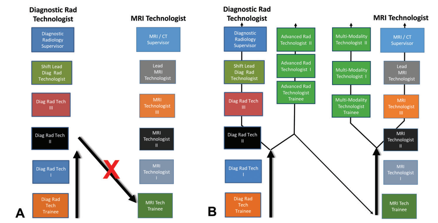 Figure 2 – A career ladder without (A) and with (B) advanced, multi-modality pathways in each cost center. Multi-modality career ladders allow an organization to cross-train modalities without the need to balance or reallocate full-time employees. A department administrator is able to cross-train through either pathway.