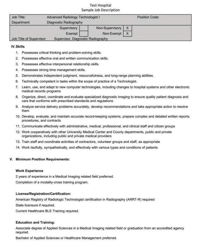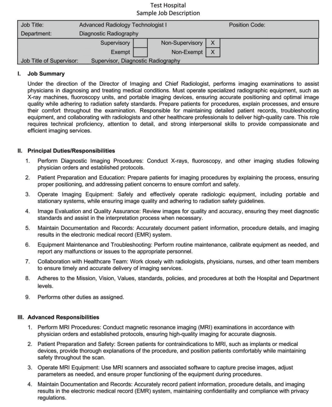 - Identify principal duties and responsibilities: To create effective job descriptions for an imaging career ladder, it is essential to tailor core responsibilities for each role, considering the unique requirements at every level. For entry-level roles, descriptions should focus on foundational duties, such as operating imaging equipment, ensuring patient safety, and adhering to standard protocols.¹⁹ For specialized roles, job descriptions should highlight modality-specific responsibilities, such as managing contrast administration for CT or optimizing image acquisition techniques for MRI. Supervisory roles should emphasize oversight duties, including team management, workflow coordination, and compliance monitoring. By customizing descriptions for each level, organizations ensure that employees clearly understand their day-to-day tasks and expectations, setting the stage for accountability and professional growth (example in Figure 4).