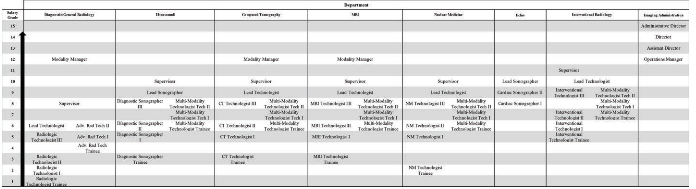 Figure 6 – An example of an organization’s salary grading structure, showing a progression of roles within the medical imaging profession, starting with entry-level positions and advancing to senior leadership roles.