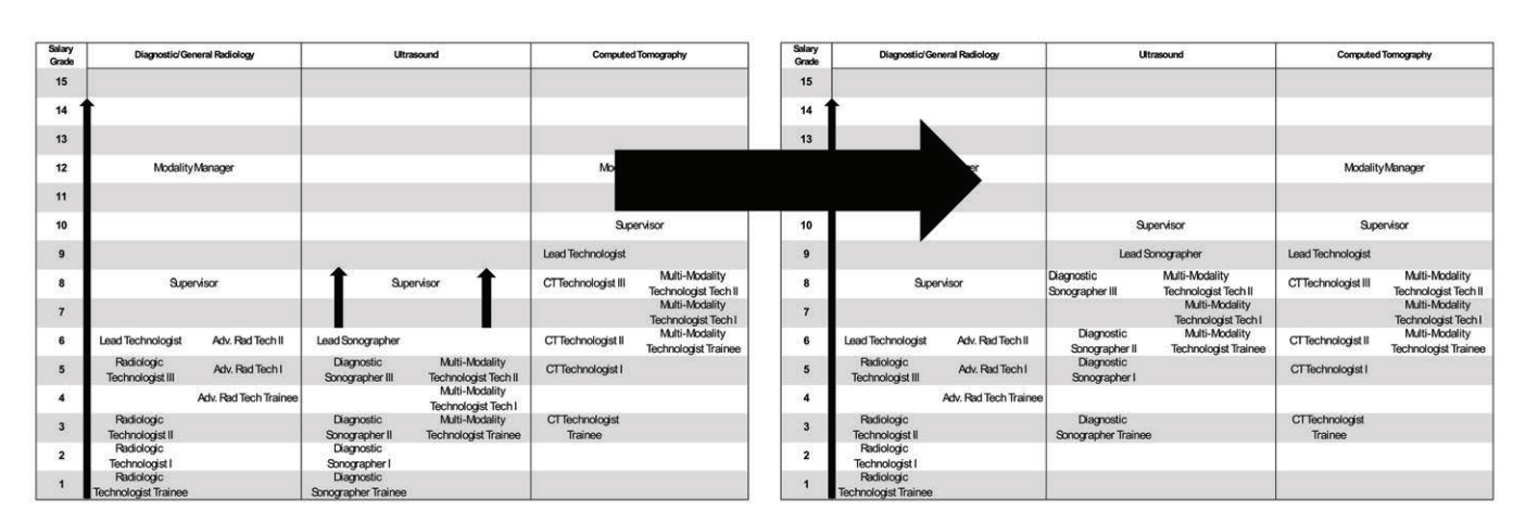 The salary grade structure also adjusts each pathway to the organization’s market. If the market region is in an area with an excess or flood of one modality, the pathway can be adjusted to align the salary grades with the market expectations. Figure 7 shows an example where the salary grades for the ultrasound pathway are placed lower on the scale due to an excess number of sonographers in the market. Aligning all the imaging pathways allows the administrator to plan and adjust salary expectations to meet the individual organization’s needs.