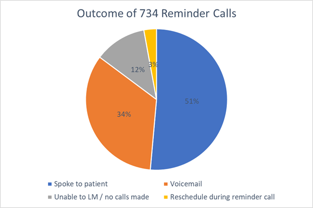Coming out of these phone calls, we also learned that a number of patients thought their appointment had been cancelled, weren’t able to make it, or needed to reschedule. Anyone needing to reschedule was immediately transferred to the schedulers. Knowing that a patient couldn’t make their appointment saved us time. The team could coordinate with the inpatient nursing teams and get inpatient exams done earlier in the day, particularly for the patients with orders to withhold food/drink until after the study.
