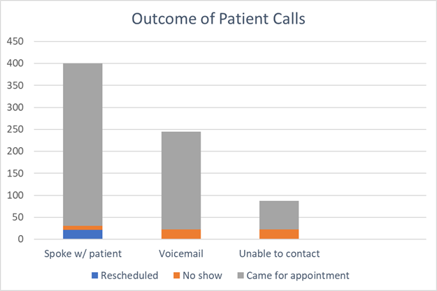 Figure 3 shows the relationship between the type of call and if the patient came for their appointment, no-showed, or rescheduled. All of the different reasons why contact was not successful were combined into “unable to contact” for this graph.