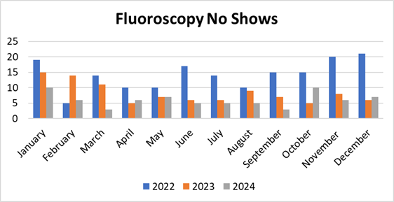 From January to April 2023, the number of no-show patients logged in the Electronic Medical Record (EMR) showed a monthly average of 11.25 patients. In the first half of May, only two patients were no-shows — a 30% reduction. Additionally, the average reimbursement for fluoroscopy procedures at our facility that year was $441.07. If seven additional patients were able to have their exams, that generated $3,087.49 of revenue that was not lost due to no-shows.