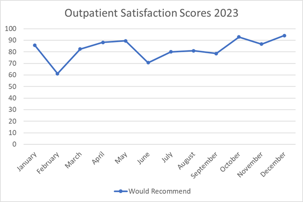 The best outcome was totally unexpected. The team ended up increasing their outpatient satisfaction score for the question “Would Recommend Facility.” (See Figure 5.) Patients and their families genuinely appreciated having the opportunity to speak with a technologist that could answer their questions before the appointment. The average score for January through April 2023 was 77%. The average score from April 24, 2023, to December 31, 2023, was 84.7%. To achieve a 6.9% gain in survey results is incredible, even when there is a detailed effort dedicated to that outcome. For that to happen unexpectedly was a wonderful reward and testament to the team’s hard work and dedication to providing excellent care for their patients.